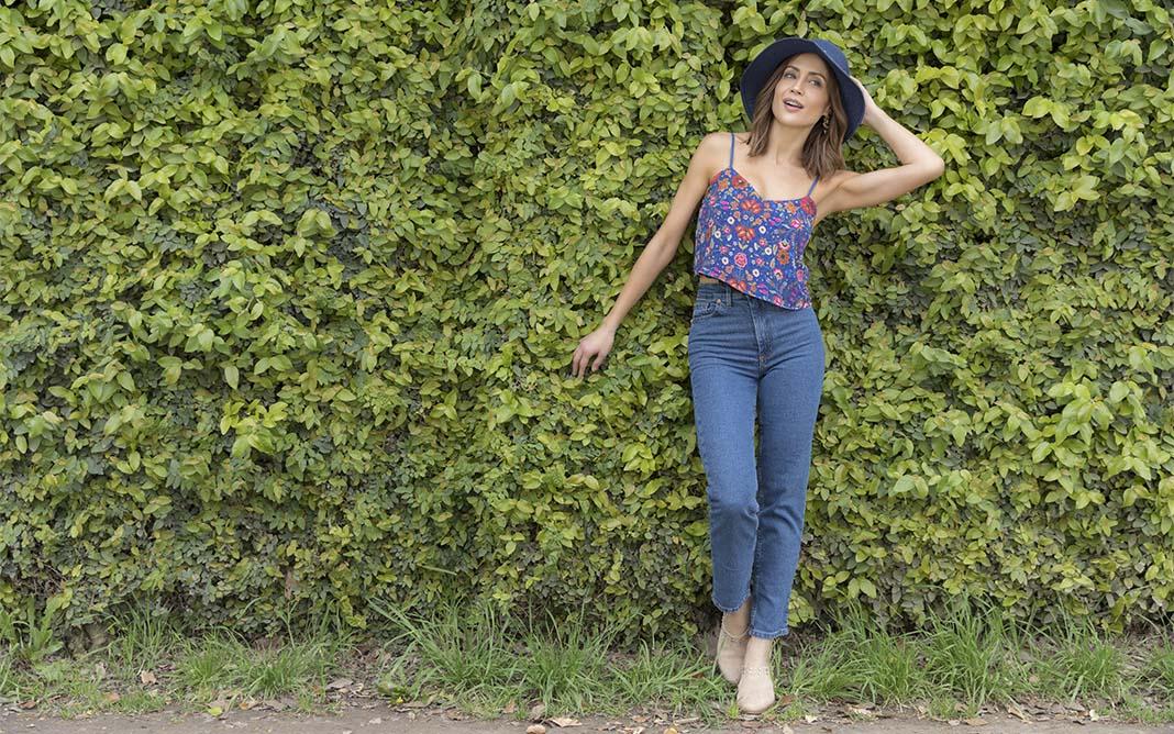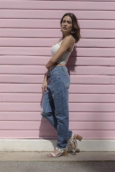Top de encaje (Rimmel), mom jean (Complot), sandalias (A Pie), aro (Luna Garzón) y gargantilla (Isadora).