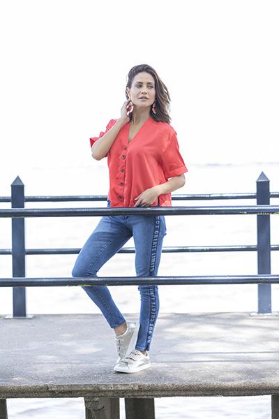 Top de lino (Las Pepas), jean con recortes (Rimmel) y zapatillas (Adidas).