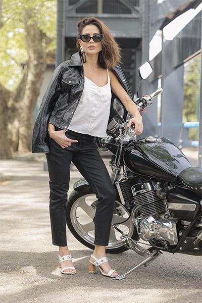 Top y jean engomado (Complot), campera de vinilo (Koxis), aros de resina (Cecilia Pont), sandalias (A Pie) y lentes (Ay Not Dead).
