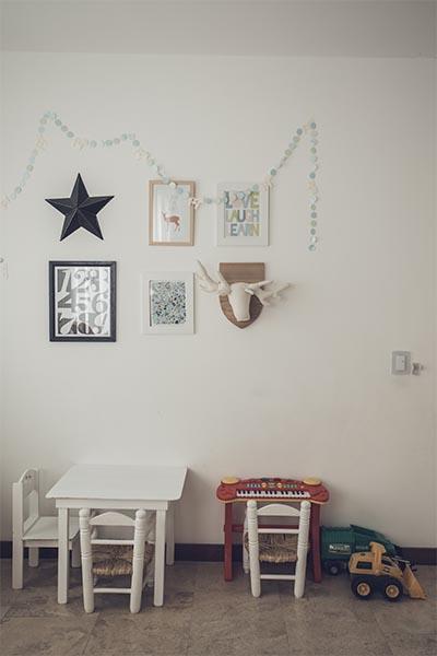 Sobre la pared se colgaron cuadros decorativos (Alegría Hunter Deco) y una guirnalda de círculos de papel que aporta unos detalles de color.