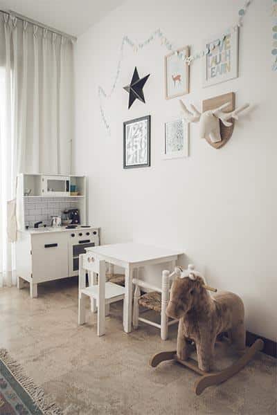 Este es un espacio donde predomina el color blanco, por lo cual la luz que llega desde el exterior hará que el lugar se vea más amplio y luminoso. Es ideal para que puedan jugar tanto nenas como varones. En un rincón se colocó una cocinita de madera supercompleta (WonderplayToys), un juego de mesa y sillas en mimbre, y un caballo mecedor para los más chiquitos (Te Como a Besos).