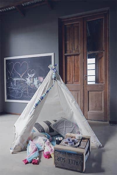 También podemos contar con una carpa tipi de tela donde puedan desarrollar otro estilo de juego. Si reutilizamos elementos, estimulamos su imaginación. Por ejemplo, podemos usar un cajón de frutas como mesita para tomar la merienda mientras juegan. Se pueden colocar platos con diseño, galletas con formas y almohadones diferentes (Karina Sdrubolini).