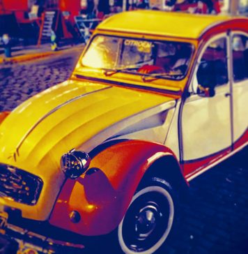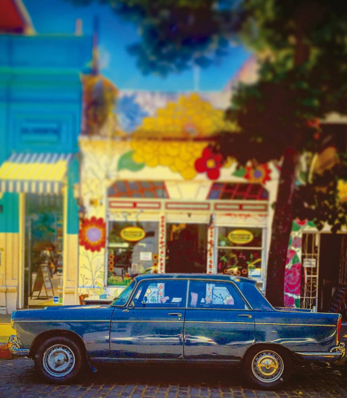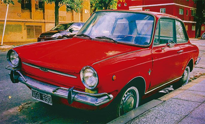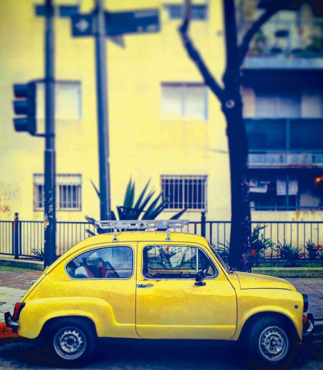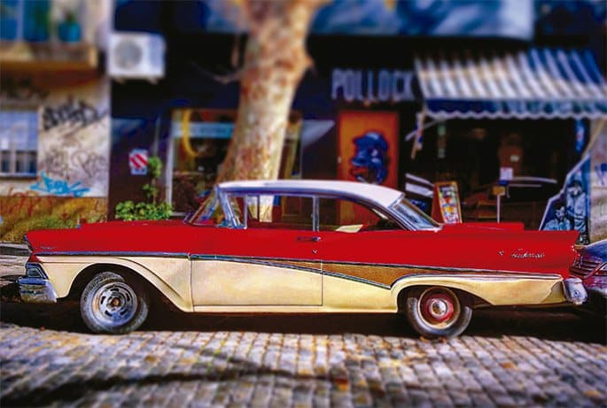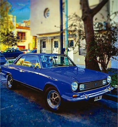 Un auto vintage de color azul intenso, una flamante cupé roja, un clásico entre clásicos bicolor, una citroneta radiante, una camioneta blanca, un fitito amarillo furibundo y un auto entre azul y violáceo por efecto de la luz se destacan contra el alegre telón de fondo urbano. Como en un juego de espejos, estos siete autos de colección se convierten, bajo la mirada del fotógrafo, tanto en el codiciado tesoro al final del arcoíris como en retazos coloridos de ese mismo fenómeno natural gracias al contraste de luces y sombras, de tonos saturados y de efectos ópticos con el que nos sorprende.