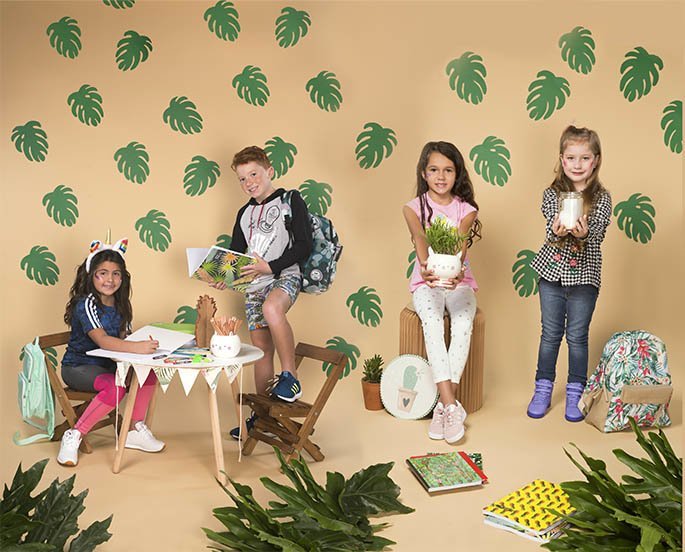 Mesa baja y maceta (Gorsh), banderines impresos y cuadro redondo cactus (Las Tinas Deco), crayones y útiles escolares (Simball), mochilas (Adidas), carpeta (Jumbo) y mochila tropical (Gorsh).