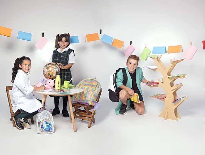 Biblioteca árbol y lapicero (Gorsh), sillas de madera (Karina Sdrubolini), mochila y cartuchera de peluche (Arre Unicornio), globo terráqueo (Don Mundo).