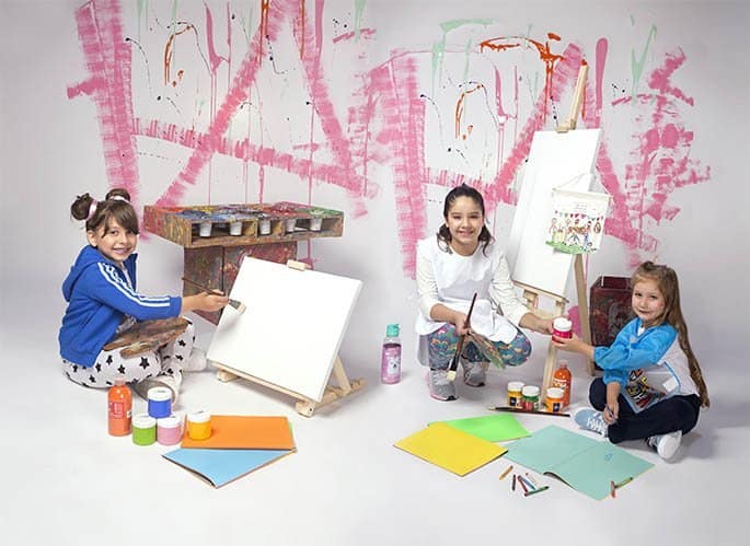 Atriles y bastidores (Di Mola Bastidores), pinturas y pinceles (Con tu Arte Distribuidora de Productos Escolares), botella llama (Gorsh).