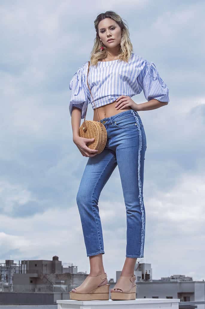 Camisa (Ampi Vera), jean con flecos (Vitamina), sandalias (Apie para Grimoldi), cartera de ratán (Madda) y aros (Gardner).