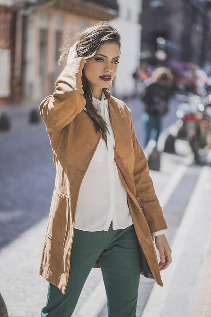 CHAQUETA: Camisa con lazo (Desiderata), chaqueta de gamuza (Estancias), pantalón de vestir (Desiderata).