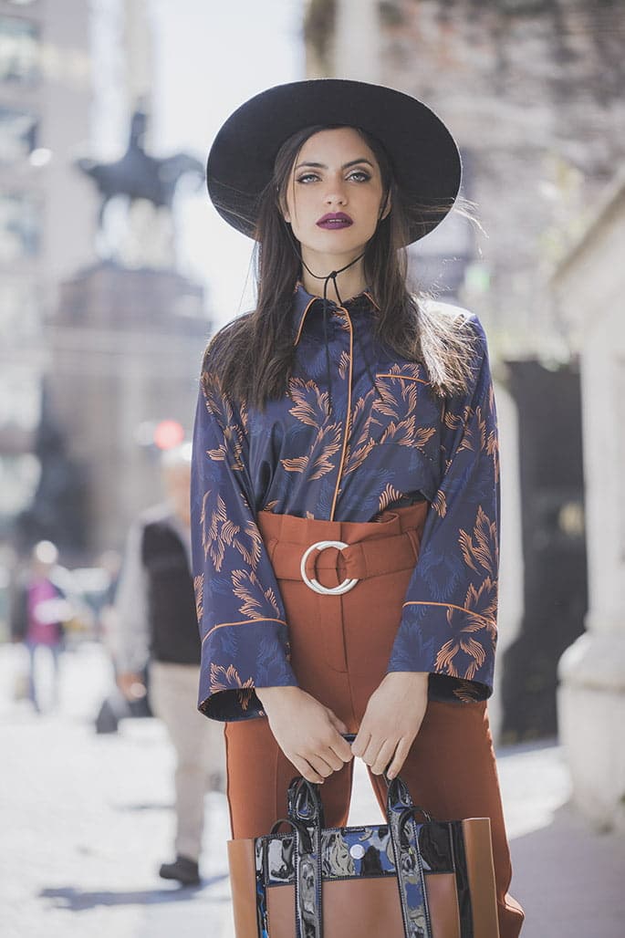 COLOR HABANO: Camisa de satén (Vitamina), pantalón tiro alto (Portsaid), cartera combinada de cuero y charol (Blaqué), y sombrero de paño (Compañía de Sombreros).
