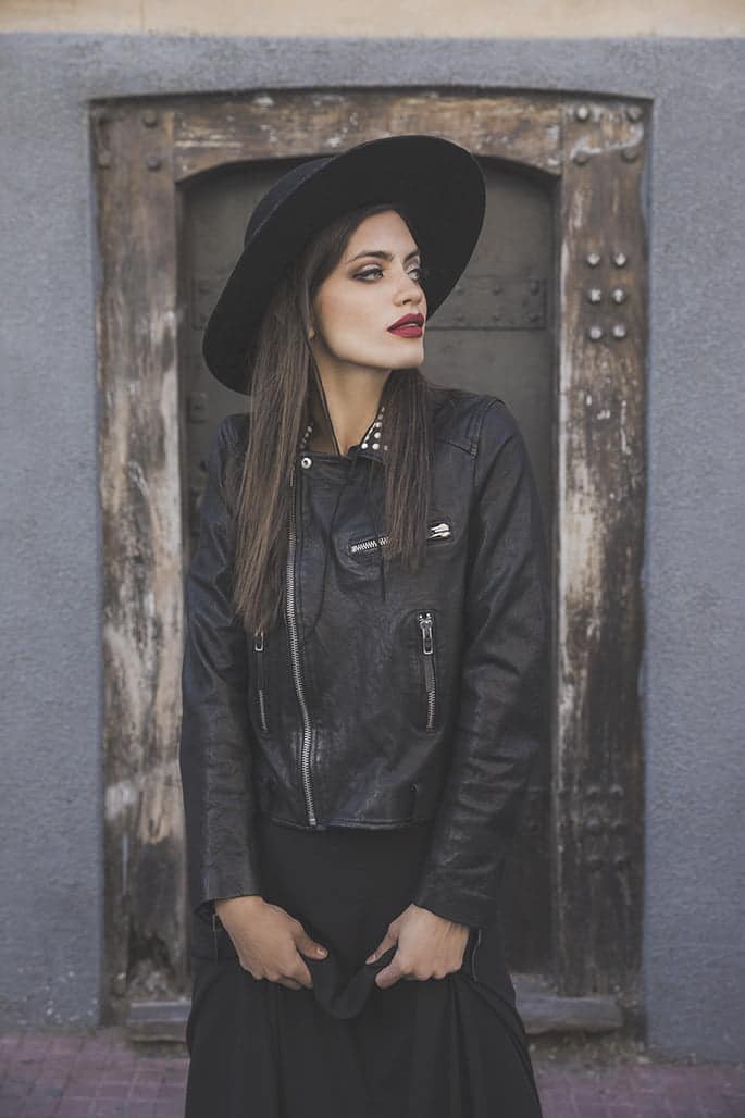 TACHAS Y CUERO: Campera de cuero con tachas (Vitamina), sombrero de paño (Compañía de Sombreros) y falda larga (Uma).
