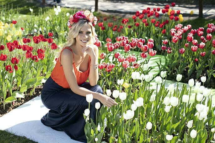 Top de satén (Zhoue), falda de raso larga (Cibeles), argollas doradas y pulsera con flores (Luna Garzón), corona de flores (Gabriella Capucci).