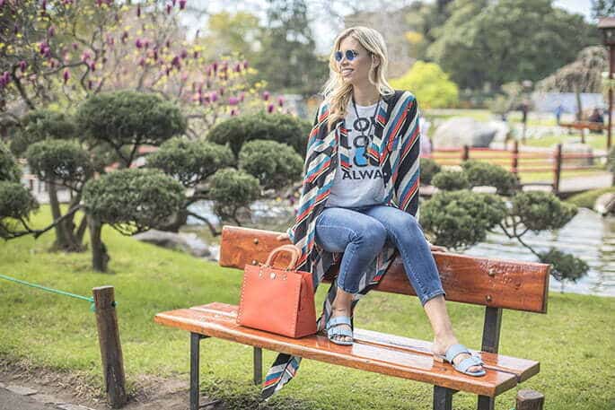 Vestido camisero (Benito Fernández), remera con inscripción (Benito Fernández), jean (Zhoue), sandalias celestes (Blaquè), cartera rígida (Blaquè), colgante de acrílico (Luna Garzón).