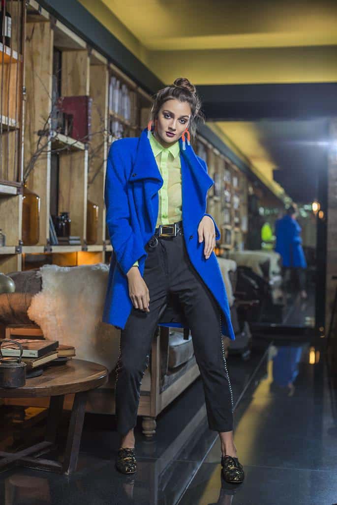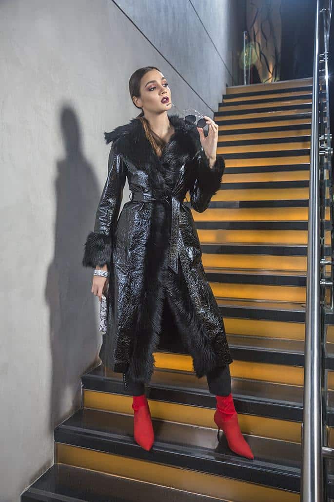 Camisa (Las Pepas), tapado de paño (Vitamina), pantalón de cuero con tachas