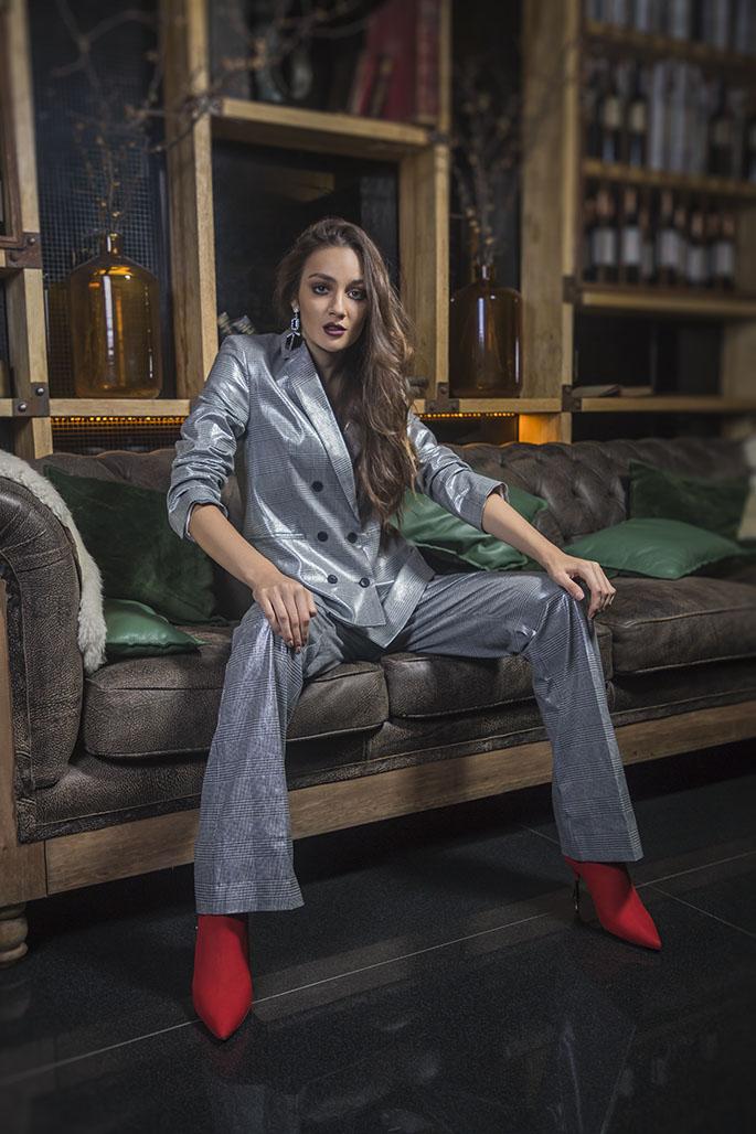 Blazer y pantalón laminados (Uma), aros con strass (Ego Accesorios) y botas
