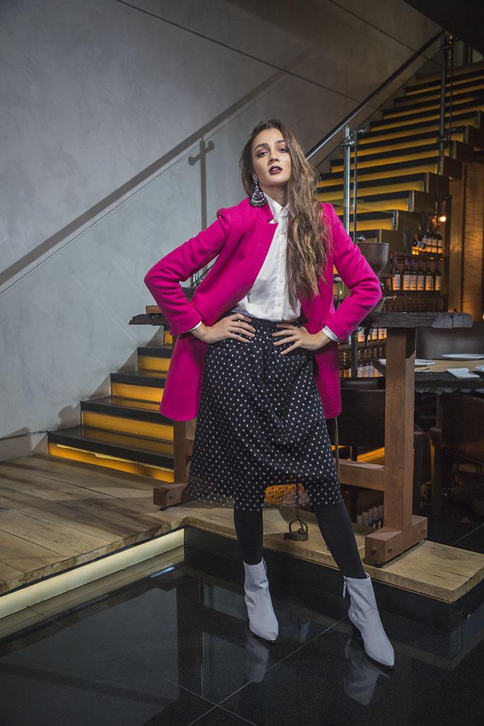 Camisa (Perramus), tapado fucsia (Las Pepas), falda de tul (Las Pepas), medias (Cocot),