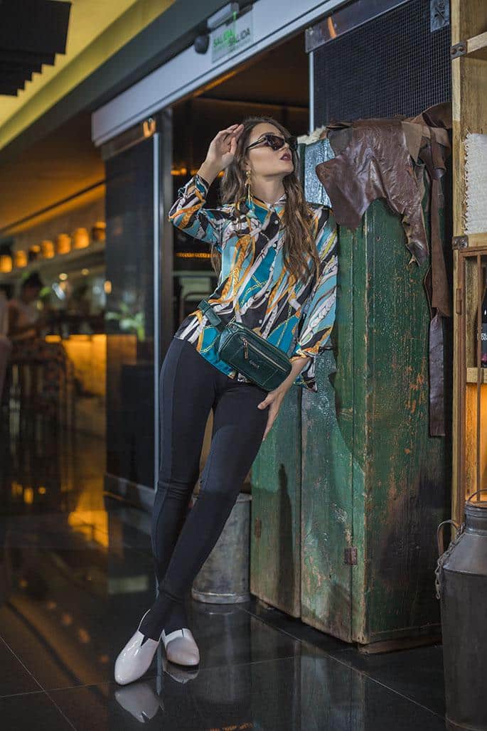 Camisa (Las Pepas), pantalón chupín (Normandie), riñonera de croco (Blaqué),