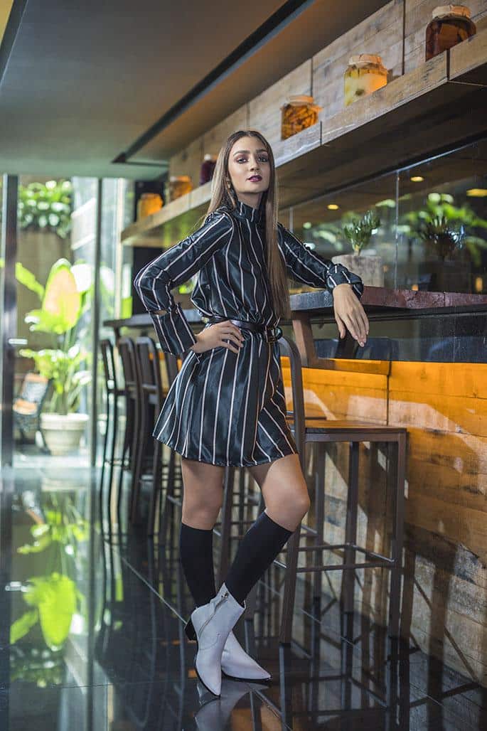 Vestido (Uma), cinturón (Normandie), medias (Cocot), botas (Blaqué) y aros