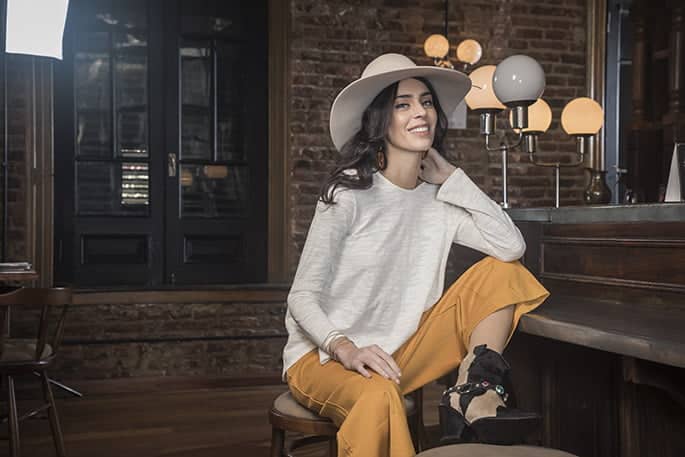 Remera manga larga de algodón (Gabatt), pantacourt mostaza (Gabatt), botas tejanas (Luciano Marra), sombrero de paño (Compañía de Sombreros) y aros (Luna Garzón).