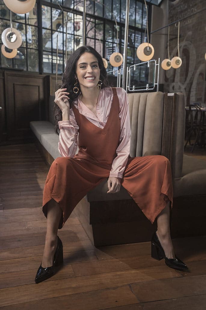 Camisa de seda (Las Pepas), suéter habano largo (Kevingston), pantalón de algodón (Cibeles), collar de resina (Luna Garzón) y abotinados (Gabatt).