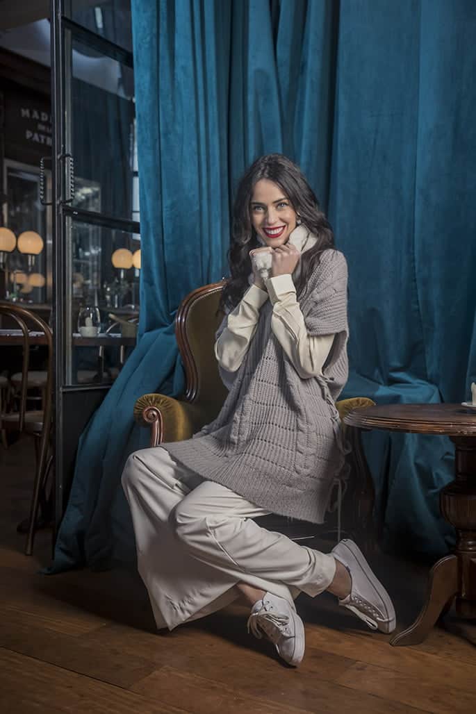 Camisa blanca (Las Pepas), chaleco de angora (Uma), pantalón de lino (Cibeles), zapatillas (Keds) y cuello de piel ecológica y lana (Vitamina).
