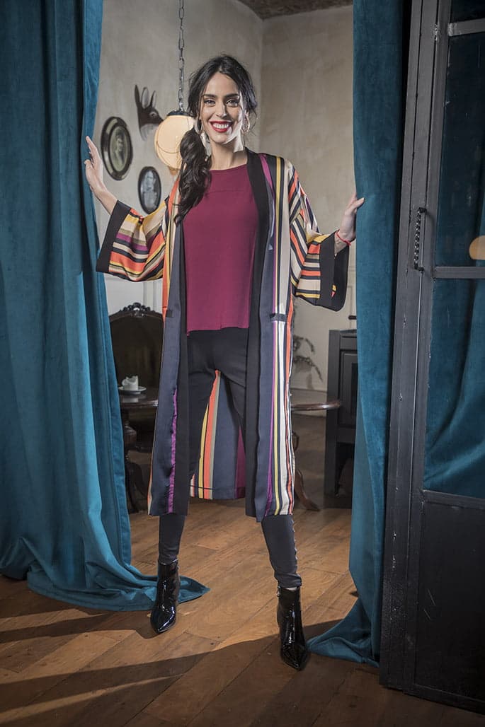 Camisa de algodón (Gabatt), kimono rayado (Gabatt), pantalón (Cibeles), botinetas de charol (A Pie) y aros (Luna Garzón).