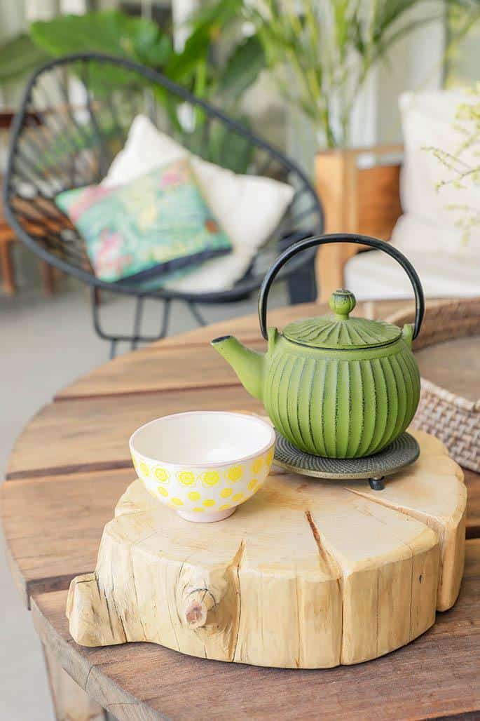 Las flores frescas siempre aportan color al espacio (Flores para Filomena), y una tetera oriental sobre una base de tronco rústica, acompaña la madera del lugar (Karina Sdrubolini).