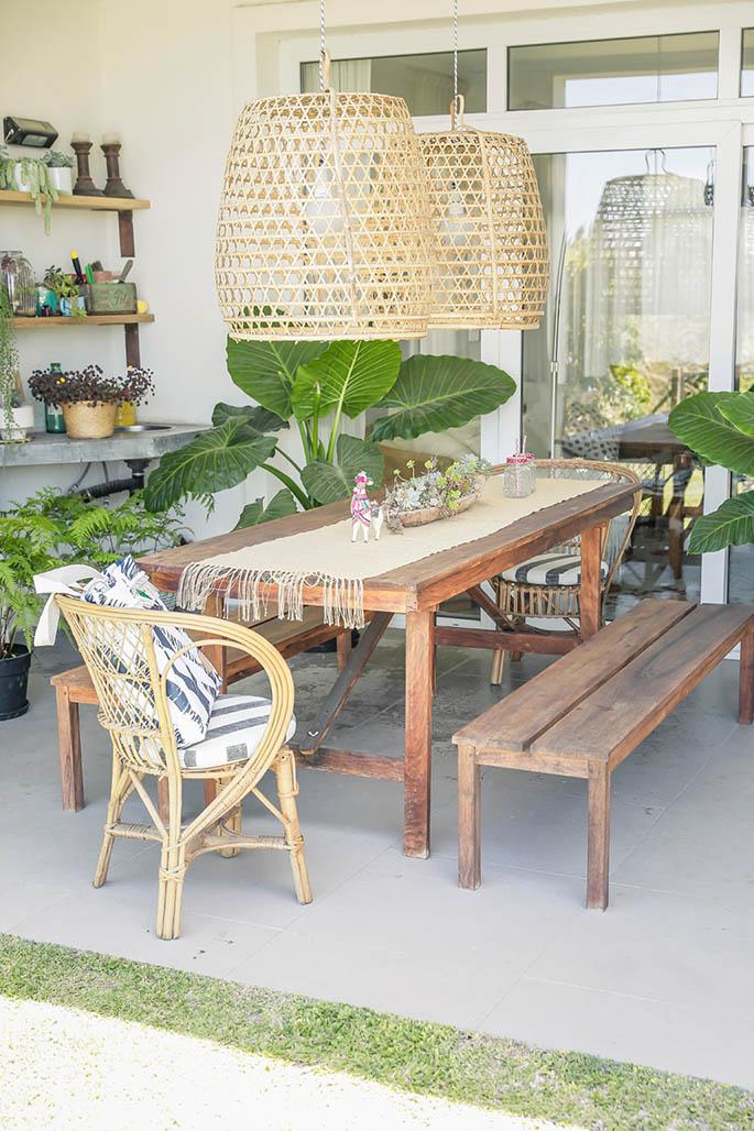 Sobre el corredor encontramos un juego de mesa y sillas de hierro, con almohadones de macramé (Modern Macramé). Aquí también se colocó un detalle natural, pero esta vez jugando con lo moderno. En una maceta con forma de elefante, se colocó una planta de fitonia, que al tener sus nervaduras blancas aporta más luminosidad (Flores para Filomena).