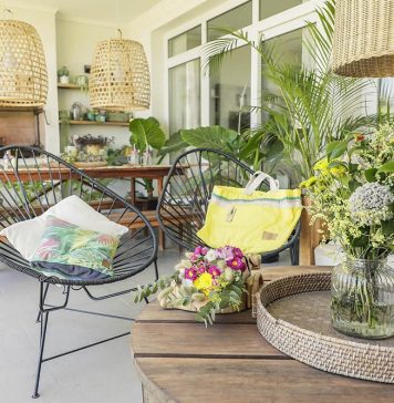 En el sector de descanso nos encontramos con sillas Acapulco, que al tener una trama abierta, amplían el lugar. También hay bolsos playeros (Honu Buenos Aires) y almohadones tropicales (ChillyDesign).
