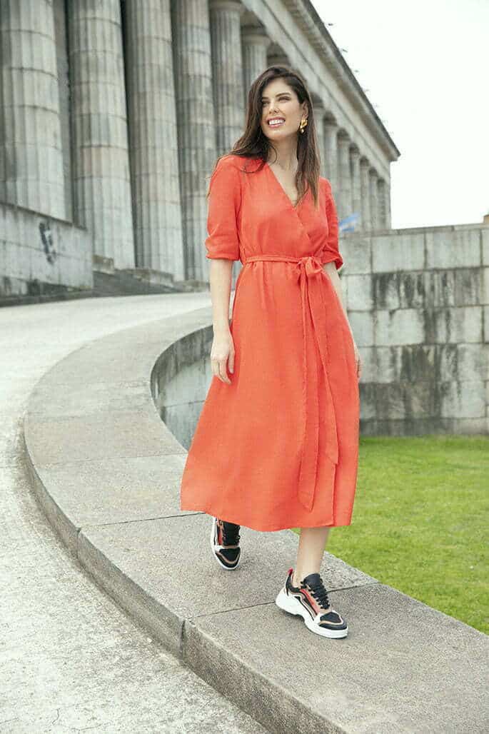 Zapatillas deportivas (Blaqué), vestido de lino cruzado (Le Porté) y aros