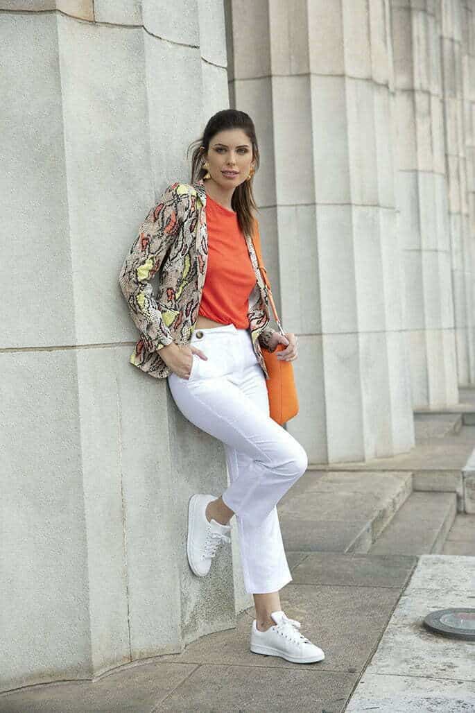Zapatillas Stan Smith (Adidas), blazer animal print (Portsaid), remera coral (System), pantalón de gabardina (Gabatt), aros (Valentina Mander) y cartera naranja (Blaqué).