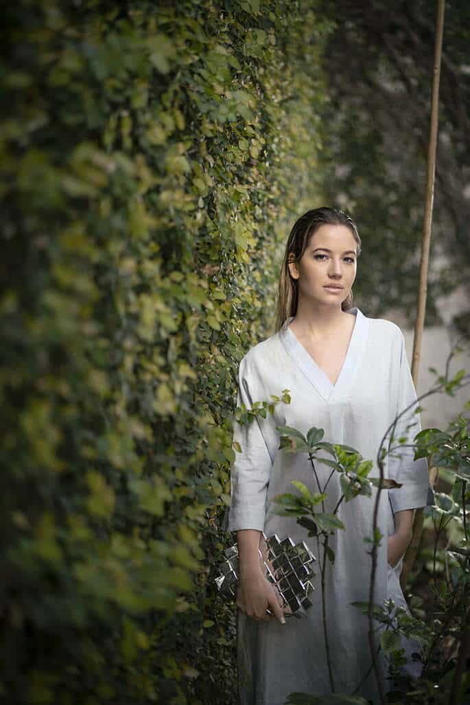 Túnica de lino (No Tag para coleccionzero.com), aros en cadena (Mai Solorzano), cinturón de rafia (Isadora), bolsa hecha a mano con hilo acerado (Clementine Bags) y slippers de cuero (Acento de Autor para coleccionzero.com).