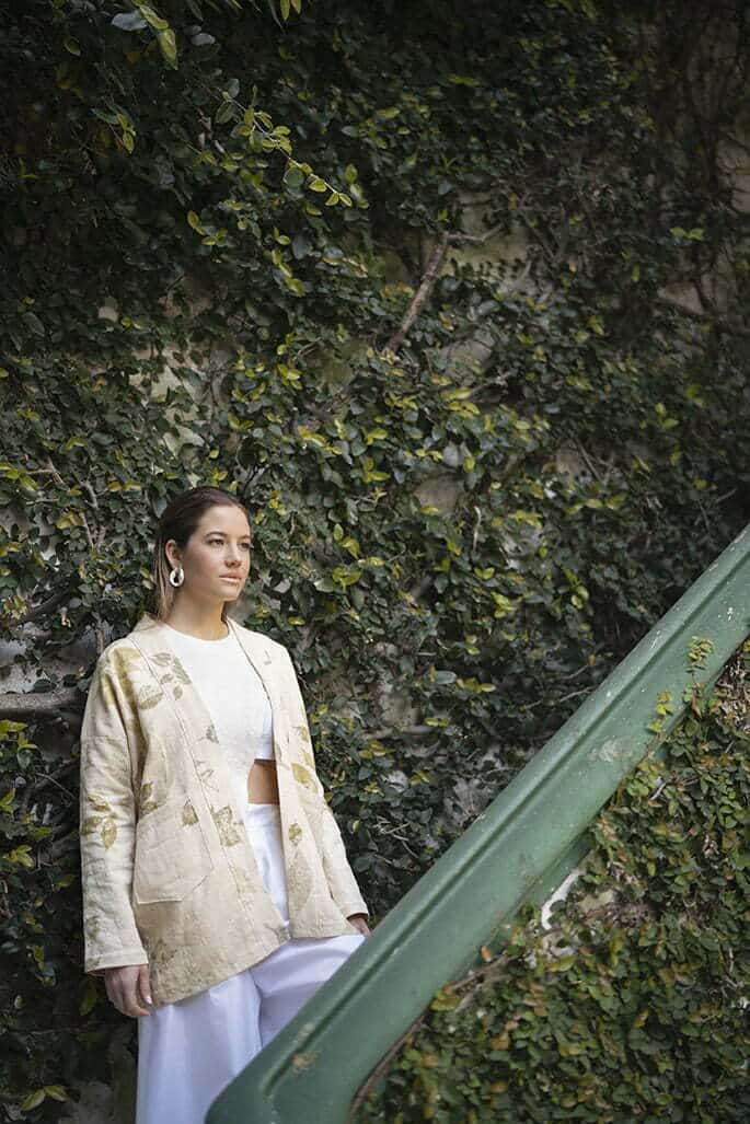 Saco de lino con estampado natural y ecológico (Jardín Estampas), top de voile de algodón chinseado y fieltro plantable artesanal, pantalón de algodón chinseado (Uzal Sustentable) y aros plateados (Isadora).