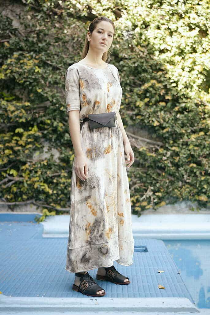 Túnica de algodón nativo con ecoprint (Luma Baez), riñonera de vinilo biodegradable sintético (Boobamara) y sandalias de cuero con detalle bordado a mano en rafia natural (Proyecto Barda).