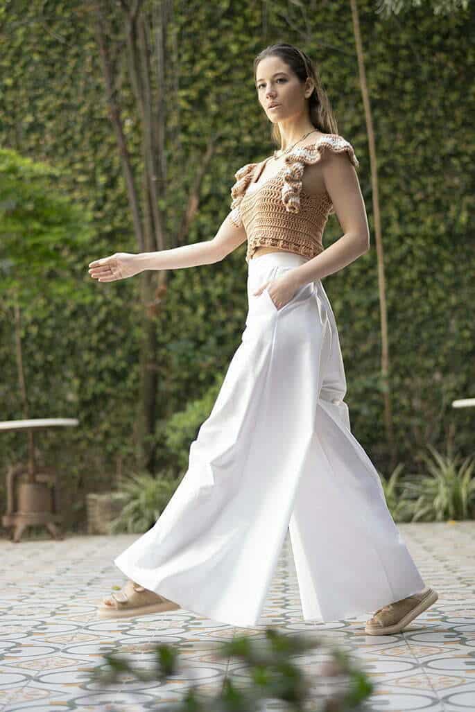 Top tejido con hilados naturales (Maydi), pantalón de algodón chinseado (Uzal Sustentable), sandalias de yute (Boobamara) y collar plateado (India Style).