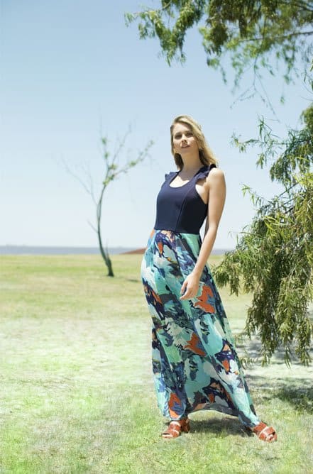 Vestido largo (Vitamina), sandalias (Uma) y aros (Valentina Mander).