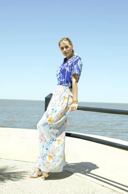Camisa (Las Pepas), falda larga (Uma), sandalias (Grimoldi) y pulsera (Valentina Mander).