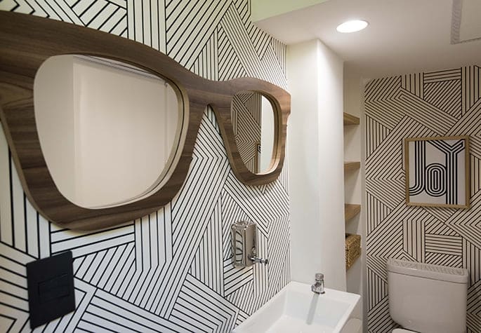 Detalle del espejo del baño realizado en madera. La casa tiene grandes espacios fusionados entre sí, no se leen límites entre los ambientes principales, hay fluidez. Al recorrerla se va descubriendo lugar por lugar.