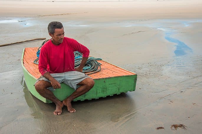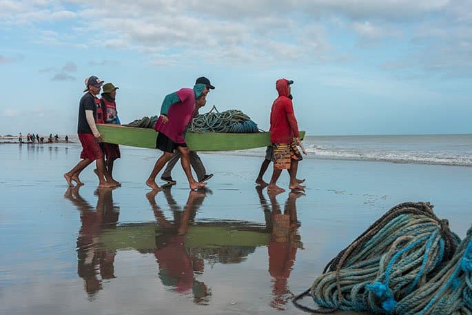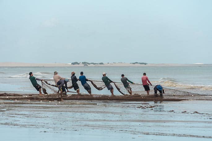Los habitantes del paraíso también tienen que comer. Son los pescadores de Jericoacoara, con su ancestral técnica manual, quienes los proveen del alimento del mar. De estas transparentes aguas del Atlántico llegan peces como el areaco, el vermelho, la garayuba, la caballa o el róbalo.
