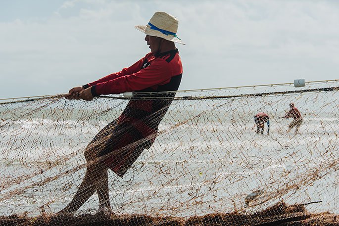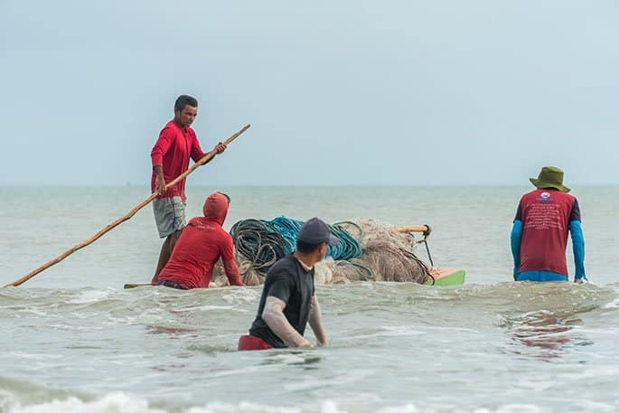 Cuando uno pregunta dónde comprar pescado, le señalan la playa. Kilómetros de playa. Ahí es donde se instalan vecinos y familiares a pescar. Pero pescar no es como ir al supermercado: no todos los días son iguales. Cuando hay mucho viento, los pescadores se quedan en sus casas porque saben que la pesca será magra. En cambio, en época de lluvia, salen casi todos los días. El método consiste en tirar la red lo más adentro del mar posible, esperar unas dos horas en la orilla y empezar a recoger para cosechar el sabroso fruto del día.