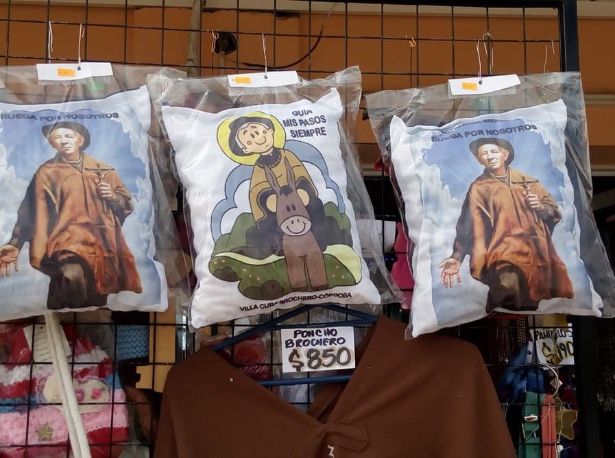 Rodeada de fieles que rezan el rosario a coro con el altoparlante, una camioneta blanca encabeza la manifestación con la imagen del santo. La escultura es de tamaño natural, lleva sombrero y los hombros cubiertos con un poncho marrón. La prenda se vende como pan caliente en los negocios del pueblo, hoy más temático que nunca. Se ofrecen remeras, manteles, tazas, bolsos, cuadritos, todo con la estampa del cura gaucho.