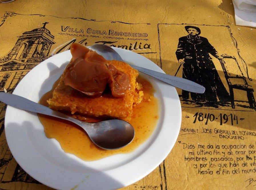 Dulce manjar para saborear frente a la plaza de Villa Cura Brochero, con mantel temático.