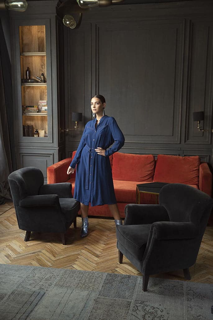 Vestido camisero (Vitamina), botinetas (Vitamina) y aros de acrílico (Luna Garzón).