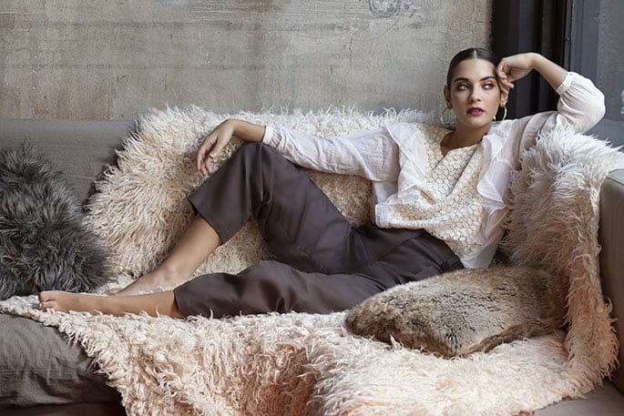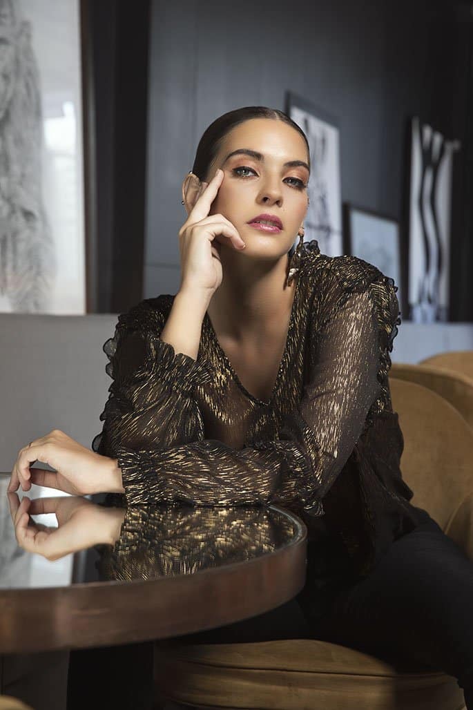 Camisa con volados (Wanama), pantalón (Las Pepas) y aros argolla (Luna Garzón).