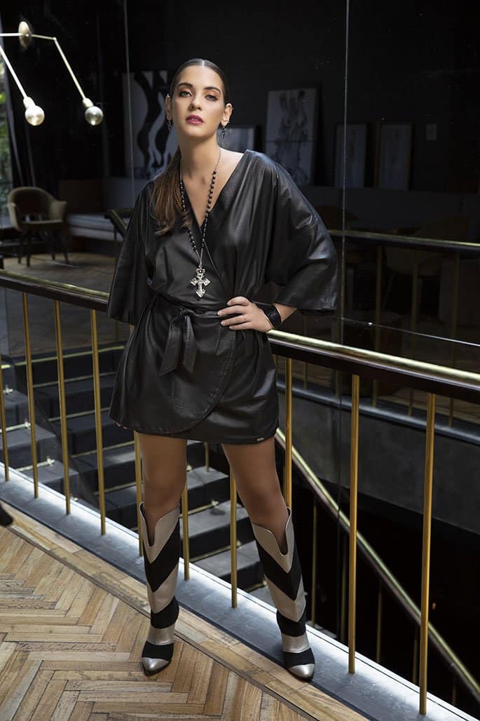 Mono de cuero (Uma), botas combinadas (Uma) y colgante con crucifijo (Luna Garzón).