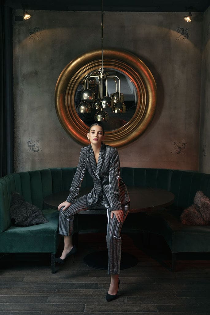 Conjunto de pantalón y blazer laminado (Uma), stilettos (Aldo para Grimoldi) y aros (Luna Garzón).