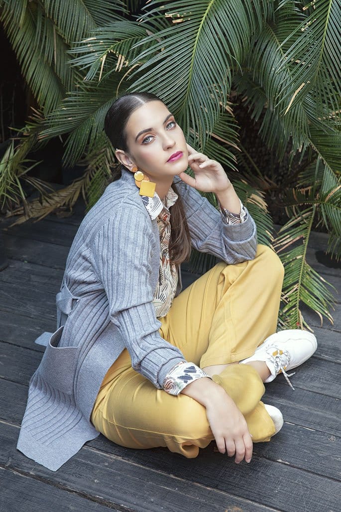 Camisa selva (Wanama), pantalón y cárdigan (Kevingston), zapatillas (Perramus) y aros geométricos (Luna Garzón).