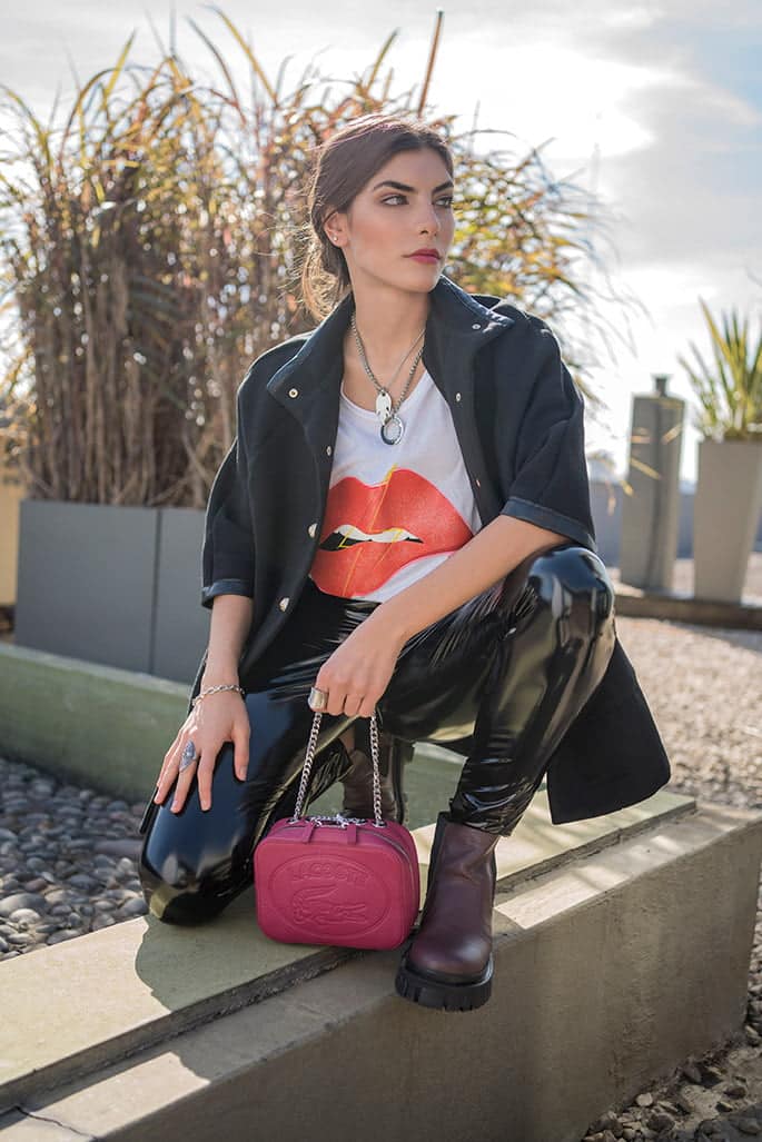 Capa y remera de algodรณn (Melocotรณn), pantalรณn chupรญn de vinilo (Delaostia), botas con suela tractor (Viamo), collares, anillos y pulsera (Mรกs Negro), y minibag de cuero (Lacoste).