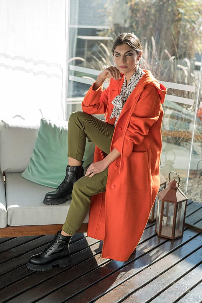 Tapado de paรฑo (Lacoste), camisa con lazo (Dolores Reynal), pantalรณn cargo (Marรฉ), borceguรญes de cuero (Justa Osadรญa) y aros plateados (Mรกs Negro).