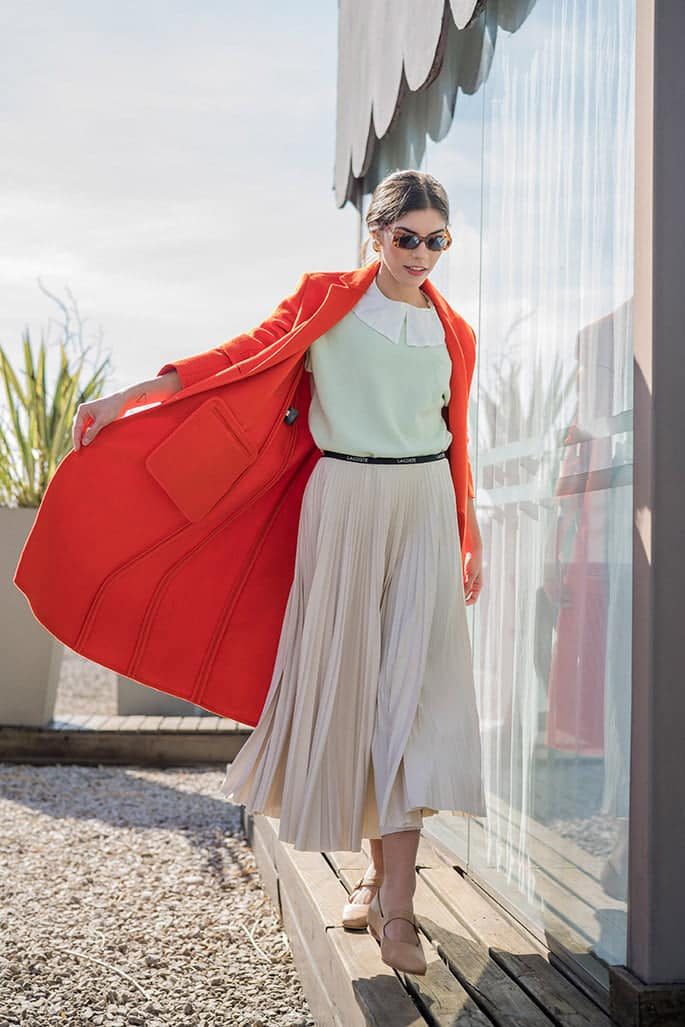 Tapado de paรฑo y camisa con cuello (Portsaid), suรฉter tejido y falda plisada (Lacoste), guillerminas de cuero (Zou Xou) y anteojos de sol y aros vintage (Chantal Vintage).