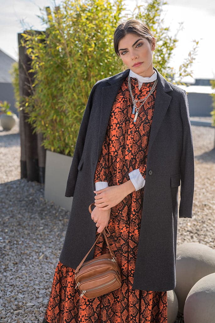 Tapado de paรฑo (Giesso), vestido estampado (Dolores Reynal), polera de algodรณn (Portsaid), bandolera (Citadina) y collares con dijes (Mรกs Negro).